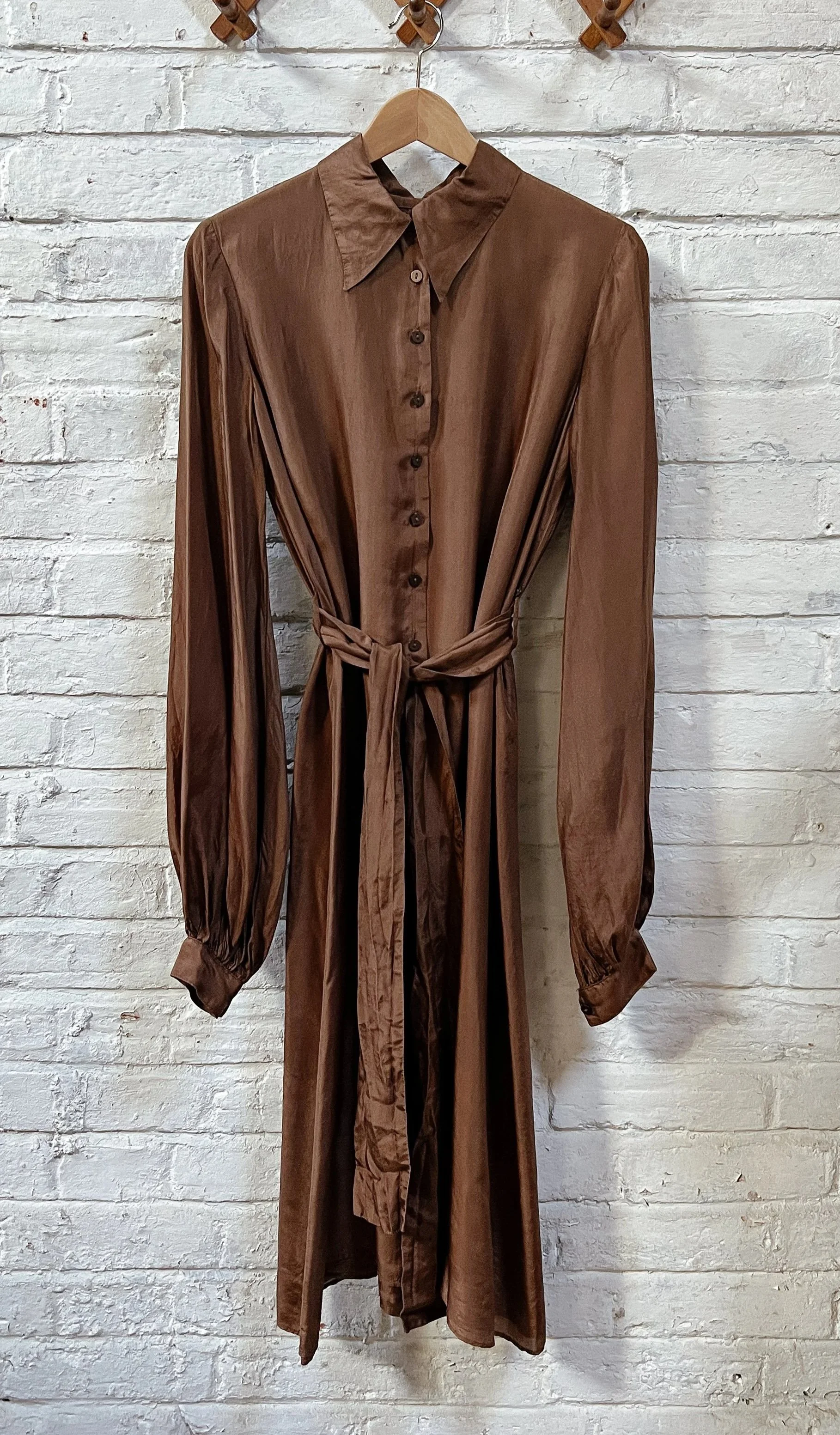 A gorgeous golden-brown silk dress that I bought years ago from the designer Susy Harper. The fabric is divine, the cut is beautiful, and all the little details are perfect, down to its billowing sleeves and little buttoned loops for the belt. But the length of the skirt is just a little too short for me. Some would say it doesn’t matter – which is what I tried to tell myself when I bought it – but I fixate on this every time I put it on, and so I never actually wear it, which is such a waste because it deserves to be seen. I finally admitted defeat, and handed it over to Amy.